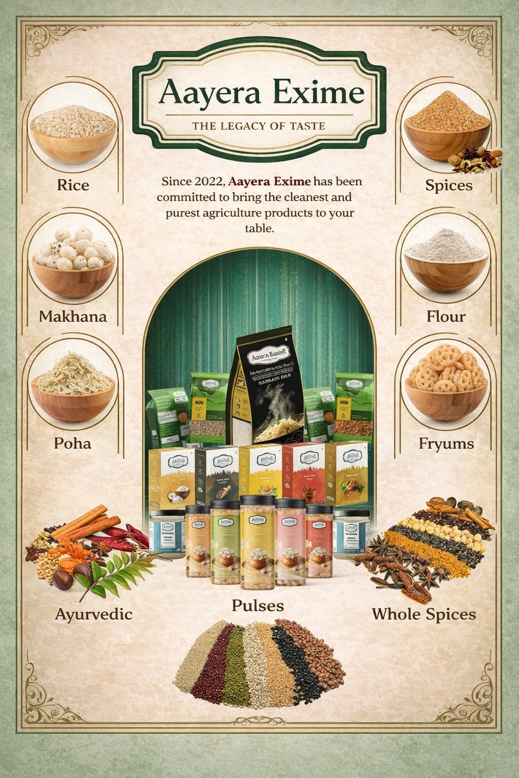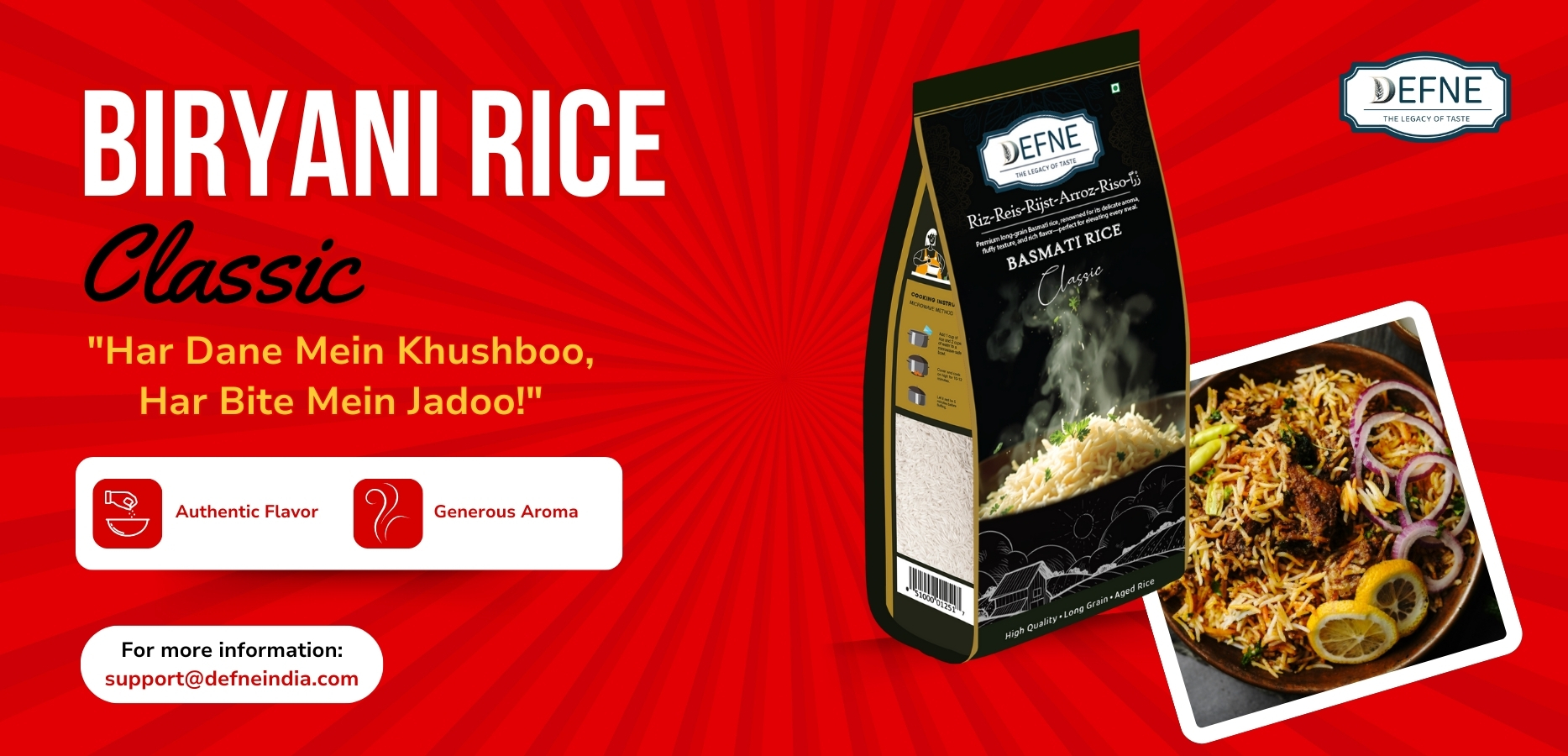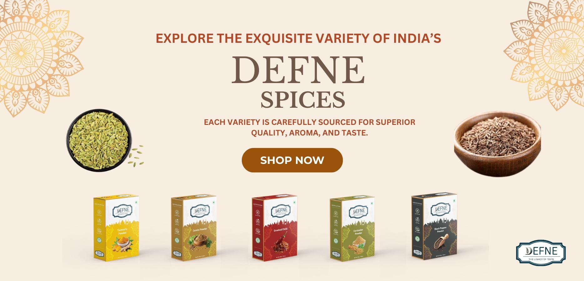 DEFNE is a brand committed to delivering premium quality ingredients that enrich your culinary experiences. Our product range spans Spices, Rice, Pulses, Ayurvedic products, Poha, Mamra and Fryums, all sourced from trusted suppliers to ensure flavor and freshness. Our mission is to bring health and tradition into every kitchen worldwide.
